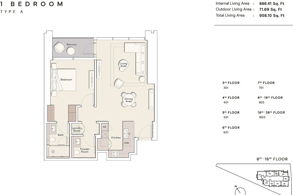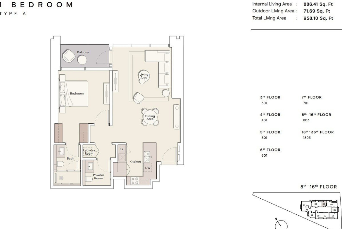 With only 1 and 2-bedroom apartments left for sale, the layout of this luxury living space consists of a dining and living area with an open plan kitchen, bathroom, laundry room, balcony, and master bedroom with en-suite bathroom.